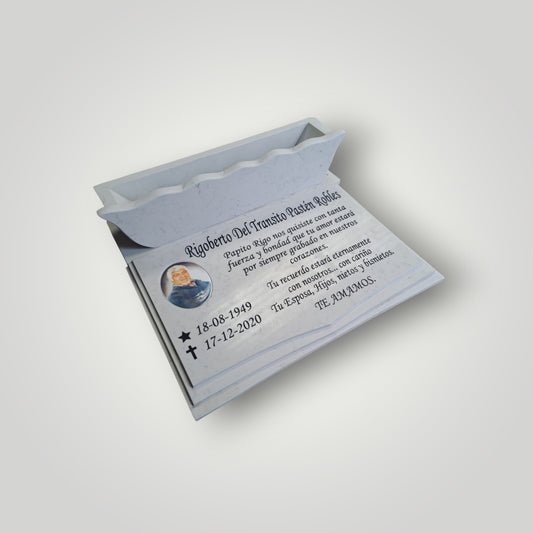 Lapida de cuarzo carrara con foto y jardinera