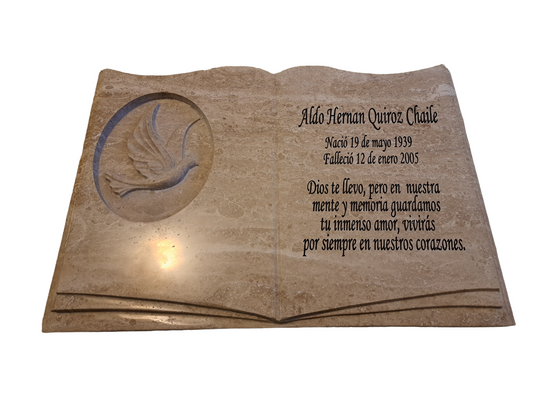 Lapida de cuarzo con diseño de libro más grabado de diseño bajo relieve.
